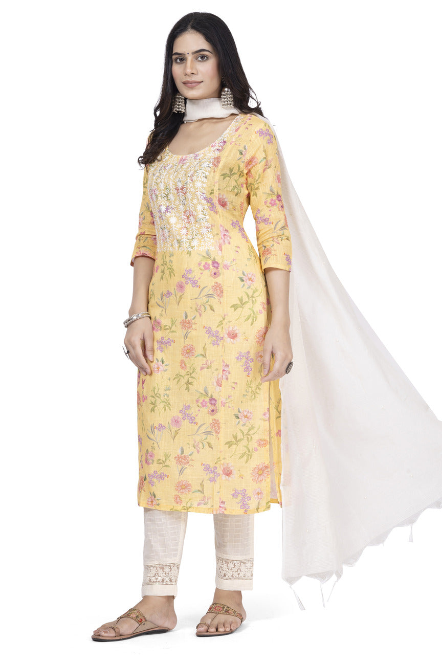 ETHNIC LINEN-COTTON DIGITAL PRINT WITH NECK EMBROIDERY KURTA 3PCS SET