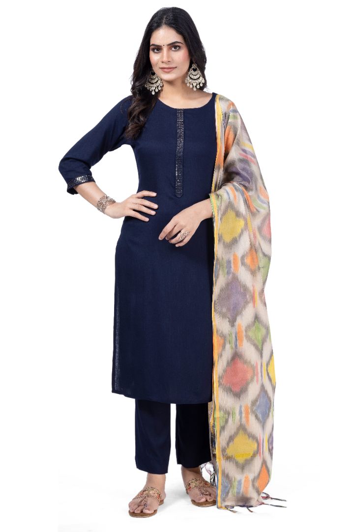 SOLID ETHNIC KURTA NECK EMBROIDERY WORK WITH IKKAT DUPATTA